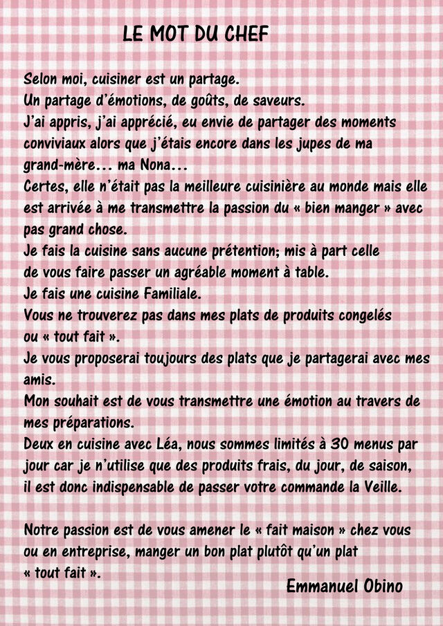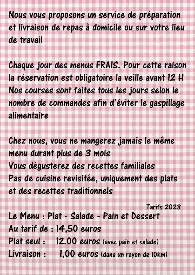 Lors de la dégustation de nos plats, il est important pour nous qu'ils soient irréprochables tant dans la saveur que dans la texture. C'est pourquoi nous étudions nos recettes pour qu'ils soient parfaits au moment de les réchauffer. Enfin, nos menus sont livrés ou récupérés à froid pour vous garantir une bonne qualité sanitaire.